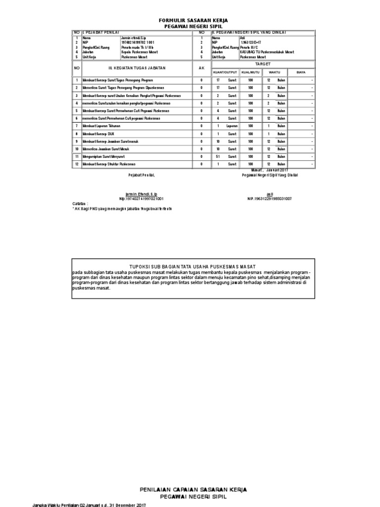 Contoh penilaian kinerja yang lain adalah penilaian kinerja guru pada lembaga pendidikan untuk meningkatkan kualitas pengajar. Aspek yang berpengaruh pada penetapan saat penilaian adalah Borang penilaian pekerja untuk kakitangan berjadual. Jenis user ini hanya memiliki otoritas mengupdate data kepegawaian dan mengisi skp. Unsur dalam penilaian prestasi kerja pns terdiri dari skp bobotnya 60 % dan perilaku kerja 40 %.